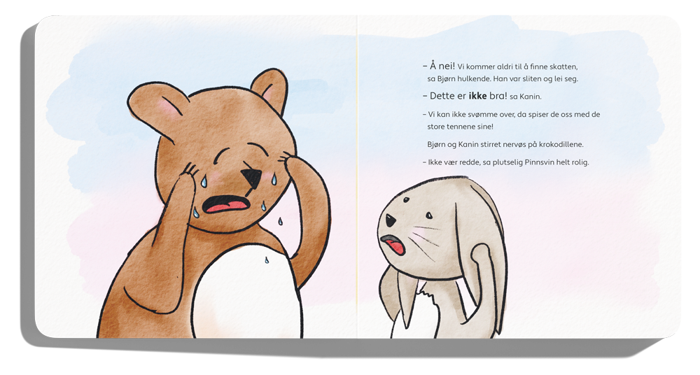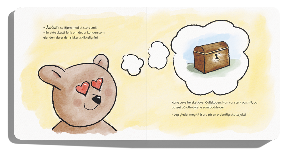 Kanin, Bjørn og Pinnsvin bor i Eventyrskogen. Stort sett pleier de å spise moreller, samle på steiner og kaste papirfly. Men en dag oppdager de et skattekart! Hva kan skatten være? Bjørn ønsker helst at skatten er honning. De tre vennene følger kartet til lands og til vanns, i varme og k-k-kulde. Når de endelig finner fram, viser skatten seg å være noe helt uventet og spesielt. «Det er den beste skatten jeg har funnet i hele mitt liv, sa Pinnsvin. Oppi kisten er det nemlig et speil – og den som ser seg i speilet er skatten.