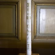 Lyset er laget i ekte stearin, er hvitt og har tolv symboler i gull: døpefont, vintre, kors, bibel, lys, åpen dør, kirke, engel, hender, brød, kalk og due. Høyde 30 cm.