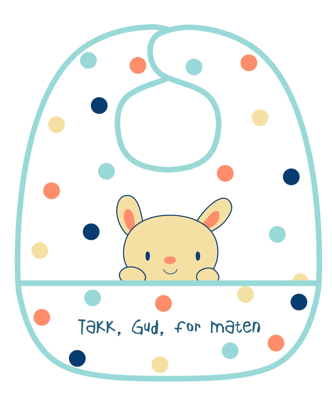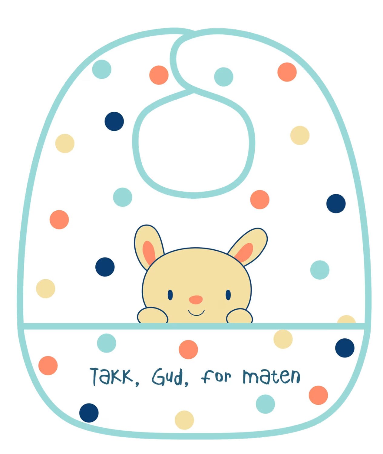 Takk, Gud, for maten står det på denne smekka. Den har oppsamlingslomme, og er laget i mykt, plastbelagt materiale. Den har borrelås og kan vaskes på 60 grader.