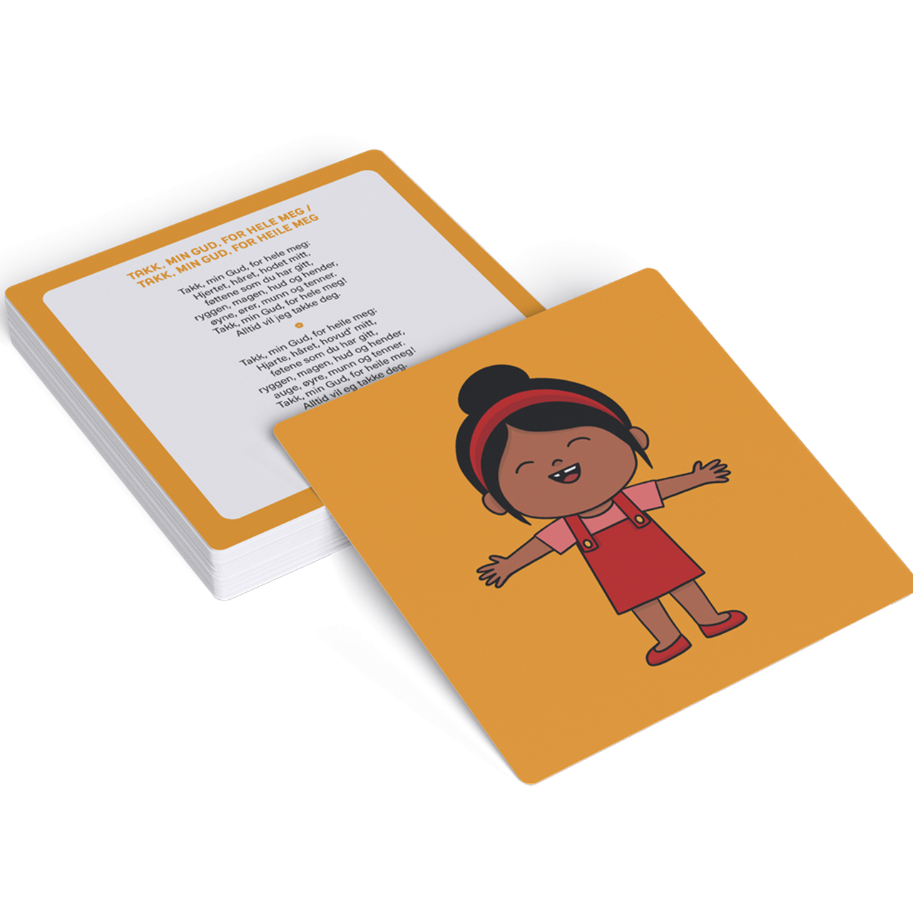 De fargerike kortene har illustrasjoner som hører til sangen bakpå. Her finner du Takk min Gud, for hele meg, Når det stormer, Gud pass på vår jord og andre favoritter.