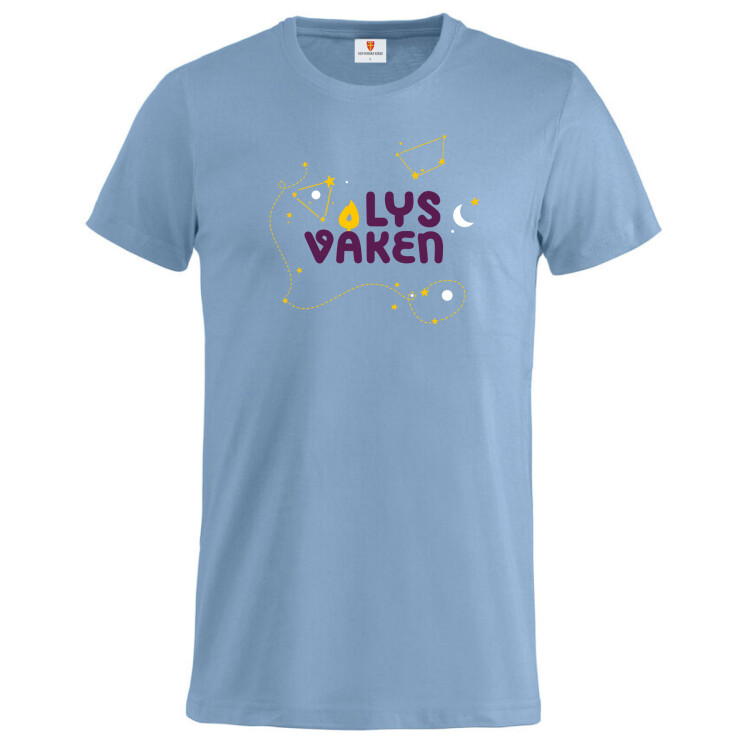 T-skjorte laget av 100 % bomull i 145 gram bomull. Lysblå farge med Lys Våken logo på front. Unisex modell.